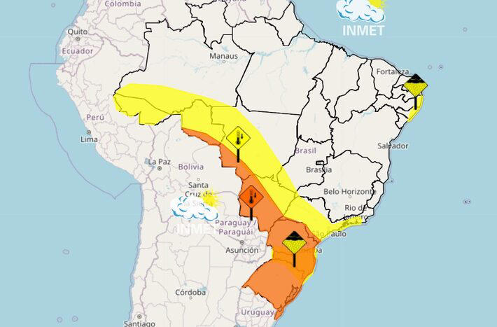 Além disso, Santa Catarina, o extremo sul do Paraná e o extremo norte do Rio Grande do Sul têm alerta para acumulado de chuvas. “Baixo risco de alagamentos e pequenos deslizamentos, em cidades com tais áreas de risco”, diz o Inmet sobre a região.
